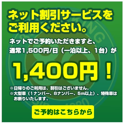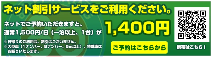 さらにネットでご予約いただきますと、一泊以上一日1,500円(1台)が1,400円でご利用いただけます。